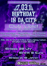 TD Entertainment präsentiert am 27.03.10 im Club Violet Neu-Ulm wieder eine Party, wo richtig gefeiert werden darf. Dieses mal steigt die Party unter dem Motto "Birthday in da City" und jeder Clubbesucher, der im Monat März Geburtstag hat, erhält freien Eintritt. Der Startschuss fällt dieses Mal um 22 Uhr.