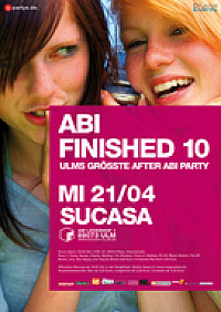 Geschafft! Das schriftliche Abitur ist für die meisten endlich vorbei und eine riesen Last fällt vom Herzen. Dieser Befreiungsschlag muss gefeiert werden! Und wo? Natürlich auf der Abi Finished 10 am Mittwoch, den 21. April 2010 - Ulms größter After Abi Party! Und es geht wie in den Vorjahren wieder richtig zur Sache: Die DJs Zhodiac und 2P, die sonst auf den zahlreichen Unipartys dafür sorgen, dass das Su.Casa bebt, zeigen Euch in Rotation auf 2 Floors, wie eine Tanzfläche bis zum Morgengrauen auseinander genommen wird! Das Beste aus House, HipHop, Electro und Party! Vorverkauf: U1, Wöhrl Plaza, Hirschstrasse. Party on!