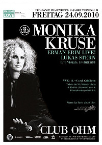 Nach spektakulärem und ausverkauftem Gastspiel von Monika Kruse 2009 im Ohm, steht an diesem Abend die Fortsetzung an. Im Rahmen von Decadance an. Sie ist die Grande Dame der deutschen Technoszene am Freitag den 24. September erneut im Ohm an den Turntables. Derzeit tourt sie durch die ganze Welt um das 10-jährige Bestehen ihres Labels Terminal M zu feiern. Seit Mitte der 90er Jahre ist Monika Kruse einer der wichtigsten & beliebtesten Techno Artists in Deutschland. Jährlich wird sie bei diversen Leserpools in der Kategorie “Bester Nationaler Dj” in die Top 5 gewählt und auch im Ausland hat sie eine rießige Fanbase. Auch dieses Jahr konnte man sie schon auf diversen Festival auf der ganzen Welt erleben. Zum 10-jährigen Jubiläum hat sich Erman Erim, der dieses Jahr seinen Premierengig auf der Nature One hatte, mit im Gepäck der live performen wird. Abgerundet wird das ganze Spektakel von Resident DJ Lukas Stern und Live Visuals by Evolution84. Einlass ist bereits ab 22 Uhr.