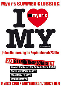 Wie bereits im letzten Jahr, macht passend zur Ferien- und Sommerzeit die STUDENTS Clubbing Party eine kleine Sommer-Pause und so präsentiert man Euch im September JEDEN DONNERSTAG im Myer's Club das Myer's SUMMER CLUBBING 2010.
