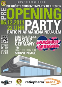 Noch vor der eigentlichen Eröffnung findet am Dienstag, 6.12. ,das offizielle Pre-Opening der ratiopharm arena stat. Es wird mächtig viel geboten! Gemeinsam mit den Hochschulen in Ulm und Neu-Ulm feiert man die größte Semesterparty in der Region. DJ MASHUP GERMANY a.k.a. BenStilller steht an den Decks. Momentan ist er auf Welttournee und beschallt mit seinem abgefahrenen Mashup Sound Metropolen wie San Francisco, Los Angeles, Rio de Janeiro oder Berlin. Unterstützung gibt’s von den local DJs Zhodiac und Steve Del Rio. Ebenfalls mit an Board sind die Mädels von IMPACT CHEERLEADING, die uns mit einer extravaganten Showeinlage verzaubern werden.