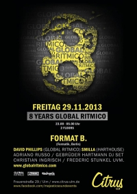 <p>8 Years Global Ritmico Label Tour<br /><br /> Massive Event on 2 Floors.<br /><br /> FORMAT B ( FOMATIK )<br /><br /> DAVID PHILLIPS ( Global Ritmico )<br /> SMILLA ( Harthouse Rec. )<br /> Adriano Russo<br /><br /><br /> GLOBAL RITMICO LOUNGE<br /><br /> Gebrüder Hartmann - DJ Set<br /> Christian Ingrisch<br /> Frederic Stunkel<br /><br /> and many more.</p>