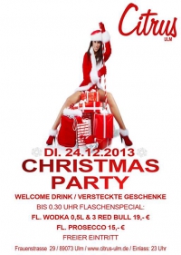 <p>Citrus lädt zur <br />Christmas Party<br />Am Dienstag den 24 .12 feiert das Citrus selbstverständlich Weihnachten.<br />Mit gewohnt guter House & Black Music ( Dj filip Riva )<br />Specials:<br />-Freier Eintritt für alle!!<br />- kleine Geschenke! <br />- Welcome Drink !<br />Drink Specials bis 0.30 Uhr.<br />Flasche Vodga ( 0.5l ) +3 Red Bull 19 Euro…<br />Flasche Prosecco 15 Euro…<br />Wir freuen uns auf euch…….<br /><br />Reservierung unter :<br />https://www.facebook.com/rene.mellert?ref=tn_tnmn<br />oder <br />Tel: 0173/6983428</p>